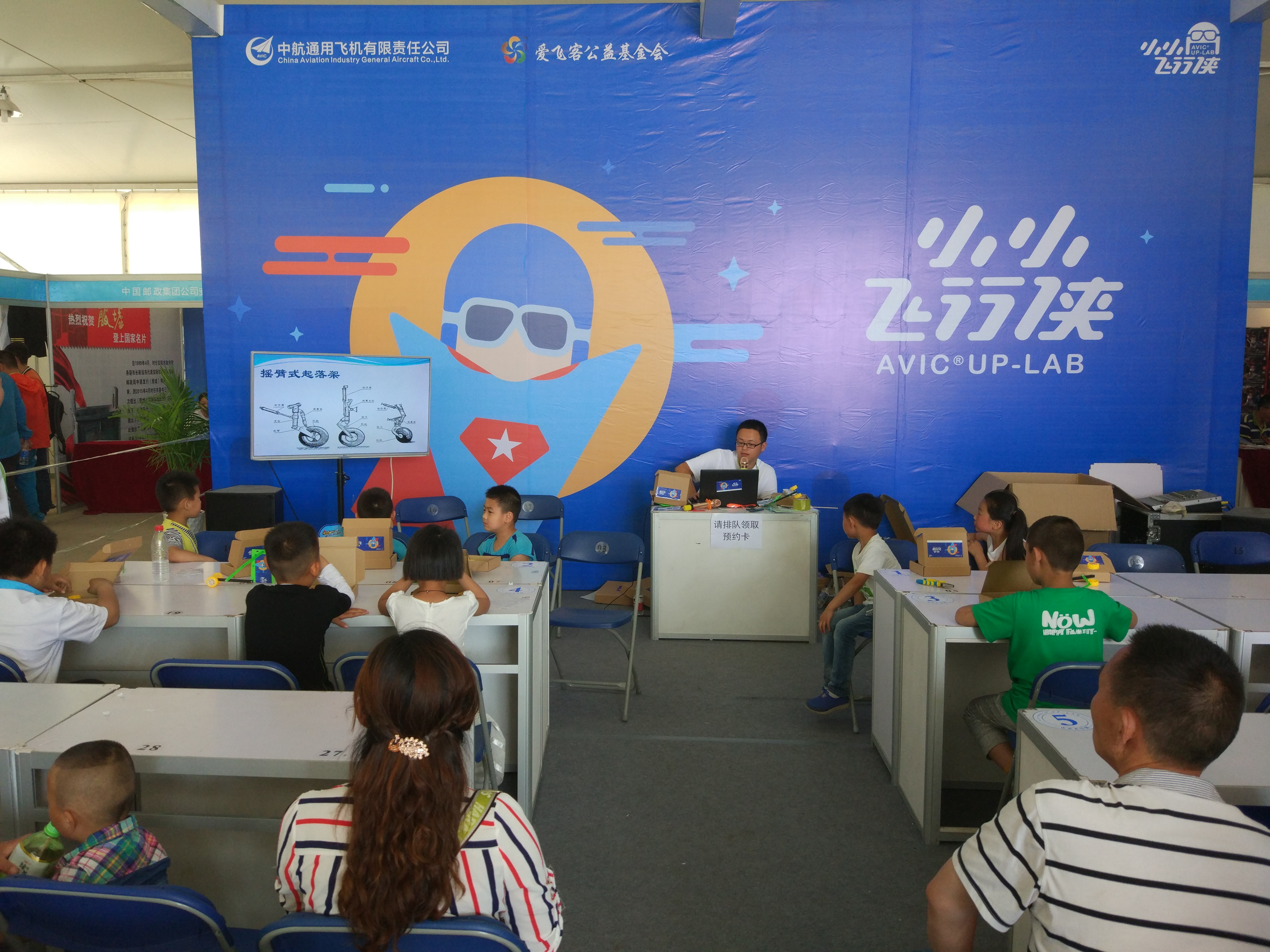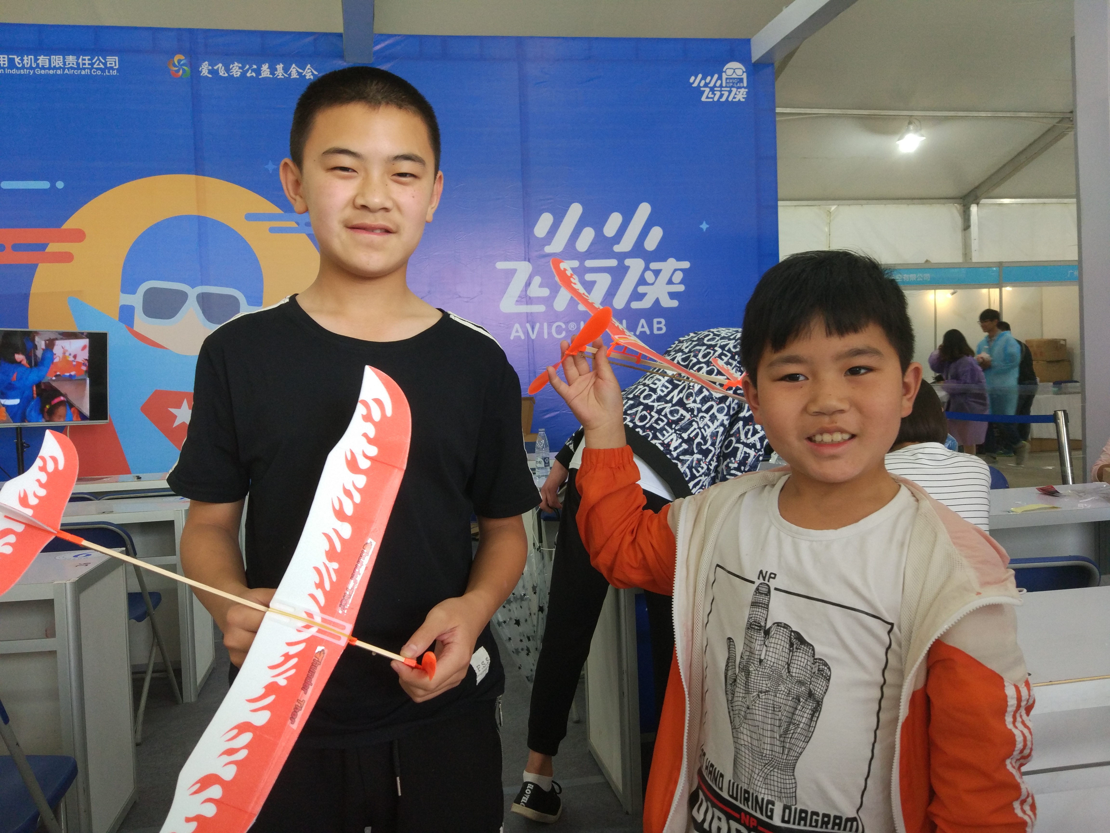 大会期间,在爱飞客公益基金会航空科普区,基金会的志愿者们向6-14岁的小朋友们,免费发放3种好玩有趣的航空魔盒,向他们讲授其中的原理知识,并现场指导制作。小朋友们都热情高涨,纷纷报名参加,在指导老师的帮助下完成了自己的小飞机、小部件。